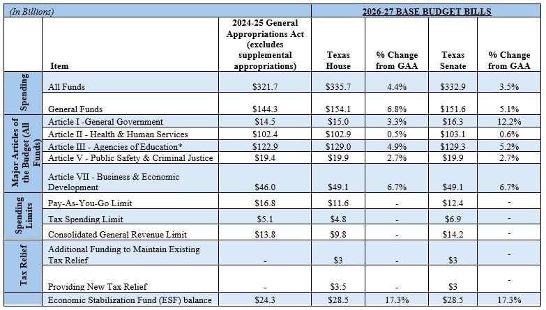 On Wednesday, leadership in the Texas House and the Texas Senate introduced substantially similar base budget bills that included a raft of praiseworthy elements. For instance, both proposals held spending growth below population and inflation, which is a key indicator of a Conservative Texas Budget. Further, each spending plan also included new money for new tax relief. Admittedly, the exact amount of new tax relief and the form it ultimately takes may change over the next few months; but it’s clear that taxpayers are certainly on the minds of House and Senate appropriators. Further still, both chambers made it a priority to fund key conservative priorities, like establishing education savings accounts (House: $1 billion/Senate: $1 billion) and border security (House: $6.5 billion/Senate: $6.5 billion).