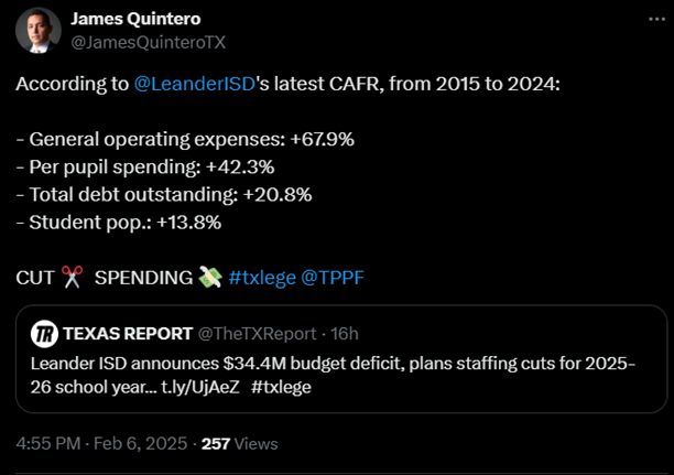 Looking at a smattering of data, it’s easy to see that there’s an imbalance between the government’s consumption of tax dollars and the demand for services. As I mentioned recently on X, consider that from 2015 to 2024, LISD’s general operating expenses rose almost 68%; its per pupil spending was up 42%; and its debt outstanding jumped by almost 21%. In comparison, its student population only increased by roughly 14%. In other words, LISD is consuming at a far faster clip than necessary.