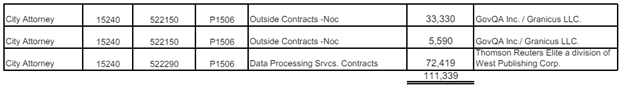 Upon receipt, I attempted to match up the information received with the revenue and expenditure data listed in the city’s adopted budget; however, this ultimately proved unfruitful. I even investigated the back of the city’s budget (i.e. Schedule E) which contains is a list of departments and outside contractors, but none appeared to be a proper fit, including the city attorney’s office which earlier listed a ‘lobbyist’ in its division summary.
