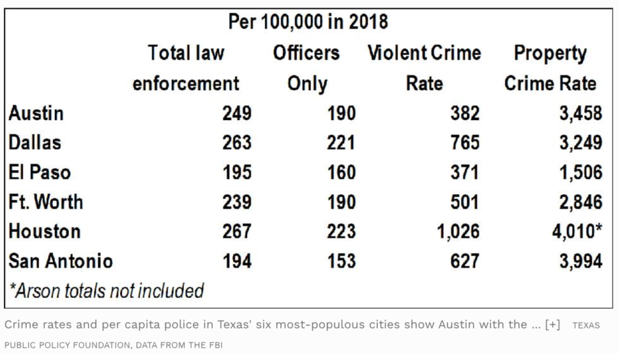 Austin had the third-highest per capita number of law enforcement officers. Measuring only sworn officers, Austin was tied for third with Ft. Worth.